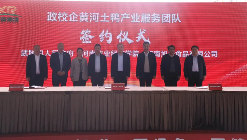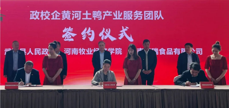 武陟縣政府副縣長(zhǎng)蘇瑞君、河南牧業(yè)經(jīng)濟(jì)學(xué)院副校長(zhǎng)楊國(guó)宇、河南旭瑞食品有限公司副總經(jīng)理邱國(guó)平為政校企三方共建“黃河土鴨”產(chǎn)業(yè)服務(wù)團(tuán)隊(duì)簽約。三方將共同構(gòu)建“政府+產(chǎn)業(yè)服務(wù)團(tuán)隊(duì)+龍頭企業(yè)”服務(wù)合作模式,推動(dòng)產(chǎn)科教融合發(fā)展。同時(shí),河南牧業(yè)經(jīng)濟(jì)學(xué)院將授予我們“百名專(zhuān)家助百村(企)工程服務(wù)基地”和“博士工作站”兩塊響亮的牌子,由12名專(zhuān)業(yè)博士為集團(tuán)提供的技術(shù)創(chuàng)新支持。